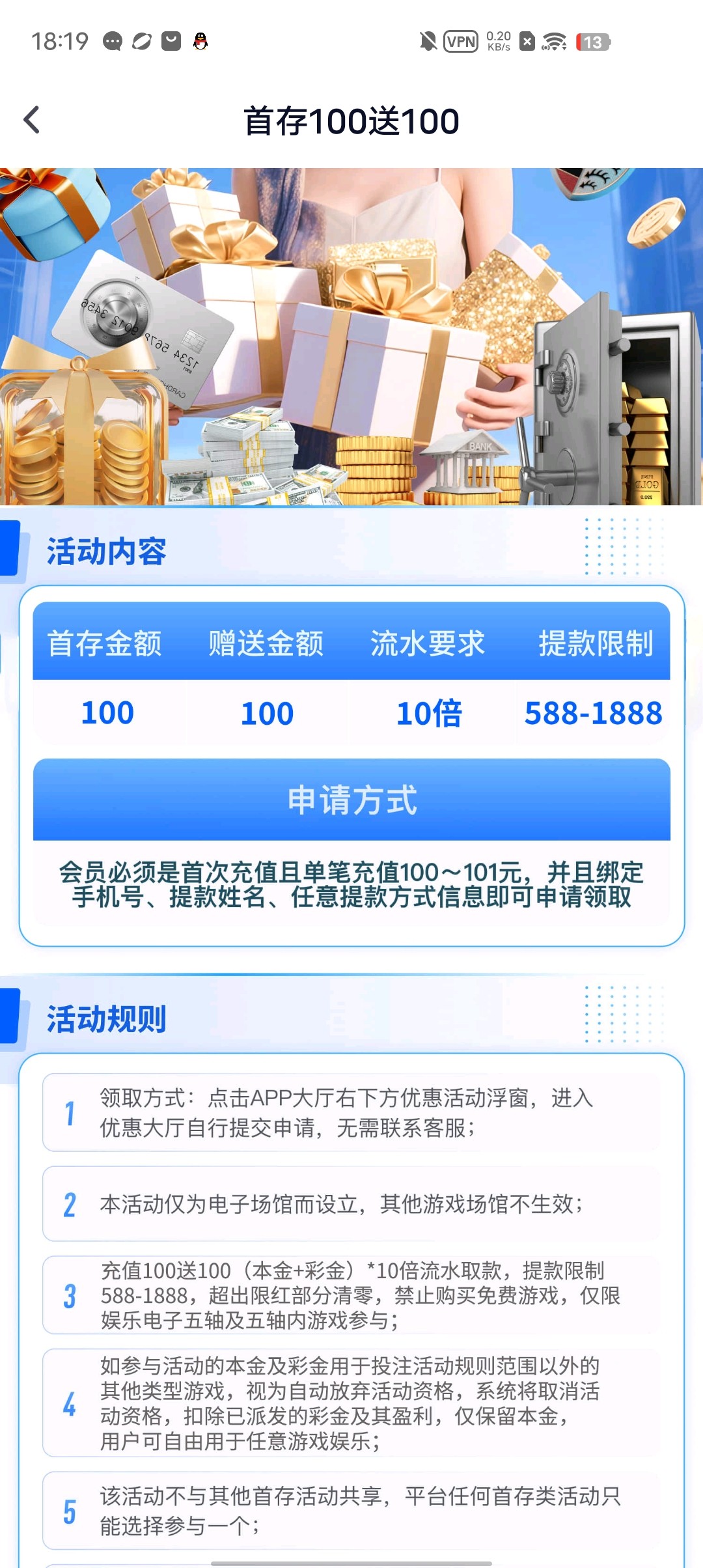 首存100+100(只能娱乐电子游戏,井且最低盈利588方可提现)、(100+100和下方首存只能选择一个)