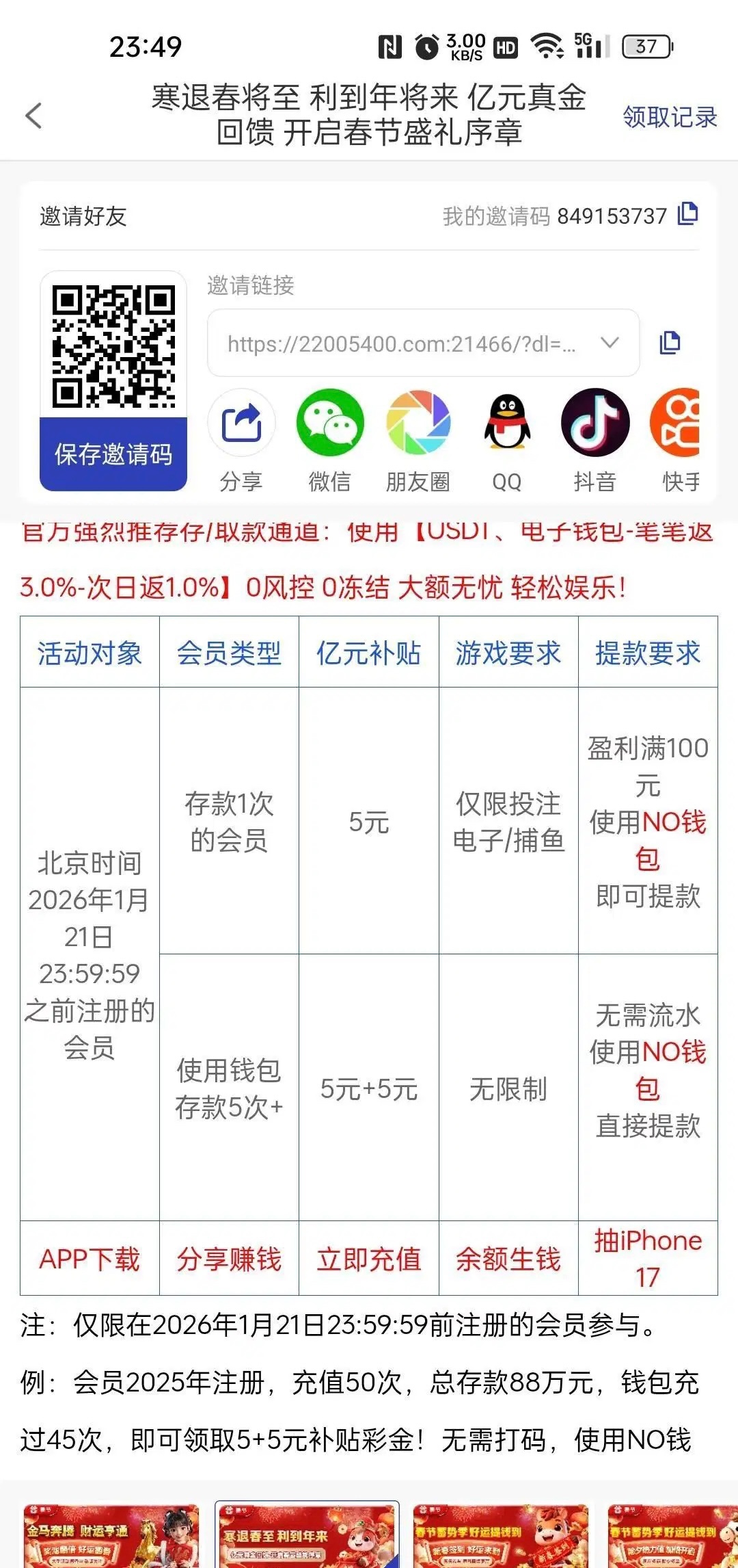 今年1月22日之前注册且有过一次充值的用户可以领五元新年彩金