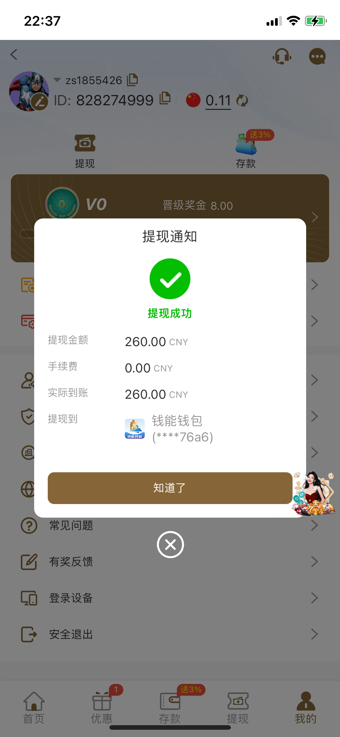 感谢,充了10块领了10小吃260